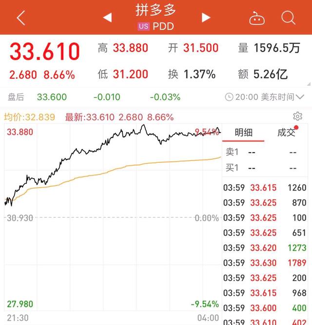 截至最新收盘,拼多多今年以来涨幅已达到近50%;昨夜盘中,拼多多股价已达33.88美元,创上市以来新高。