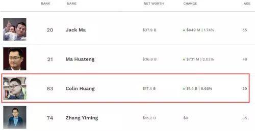 拼多多股价大涨,受益者创始人兼CEO黄峥的实时财富也达到174亿美元,跻身中国大陆十大富豪之列,排名第七;在互联网富豪中排名第三,仅次于马云和马化腾。