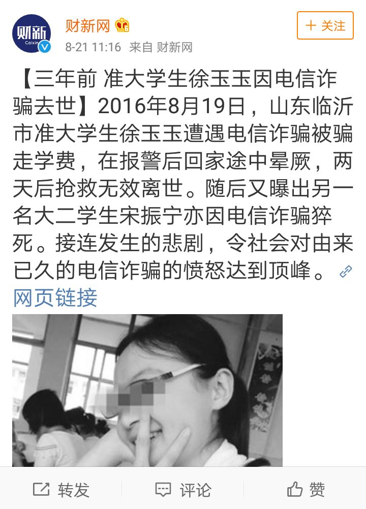 18年8月19日,准大学生徐玉玉遭遇电话诈骗被骗走学费,在报警回家途中晕厥,两天后抢救无效离世。