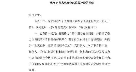 对此,奥克斯家电事业部总裁冷泠不再沉默,在8月30日晚发布了一封《致董明珠女士的公开信》,向董明珠喊话称:“您选择‘举报’的方式,与我们竞争。而现在,我们选择截然不同的方式,陈述事实,表达观点。所以我们将在下周一(9月2日),主动向您提供格力空调能效不合格的拆解视频,我们觉得这比赶在618大促前夕举报,更纯粹,更坦荡。我们更想以此表达善意,避免这个视频,影响格力的销售。”