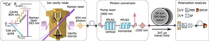 测试表明,光子不仅可以在长达 50 公里的光缆行程中存活,且即便在经过了波长转换之后,也能够保持与离子的纠缠态。