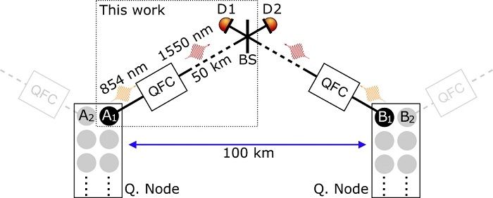 比如相距 100 公里(62 英里)的钙离子,可以与它们的纠缠光子相互映射,在路程中间的一个交叉点相会。在那里,两个光子可能彼此纠缠在一起,并失去与离子的连接。