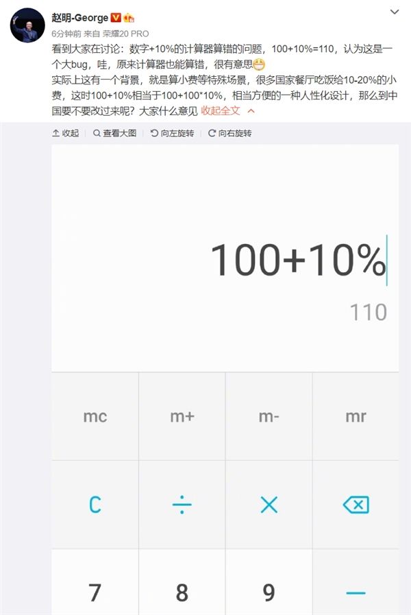 荣耀赵明解释手机计算器10%问题:国外算小费惯用、相当人性化