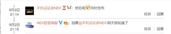 9月2日晚间,有网友在vivo NEX智慧旗舰微博下留言问NEX 3发布时间,官方微博回应“明天就知道了”, 暗示今天将公布NEX 3 5G发布时间。