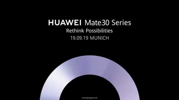 9月1日下午,华为消费者业务CEO余承东在微博释放了一幅重磅预热视频,配以“9月19日,我将在德国·慕尼黑 Mate系列最新力作——华为Mate 30!十分期待到时与大家共同见证,它给我们带来的无限可能。”文案, 虽然视频内容仅为一个金属圆圈,但片尾配文则透露出了众多消费者关注的重磅消息,那就是华为Mate 30系列将于2019年9月19日在德国慕尼黑发布。