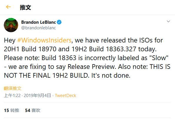 此外,LeBlanc明确指出19H2 Build 18363.327并非“最终RTM版本”,未来还将会发布更多的版本更新。作为Windows 10 May 2019(Version 1903)的后续功能更新,19H2版本迎来了一次不同以往的测试过程,同时面向Slow和Release Preview通道用户进行了A/B测试。但是更新幅度都不是很大,主要以优化后台性能和修复BUG为主。