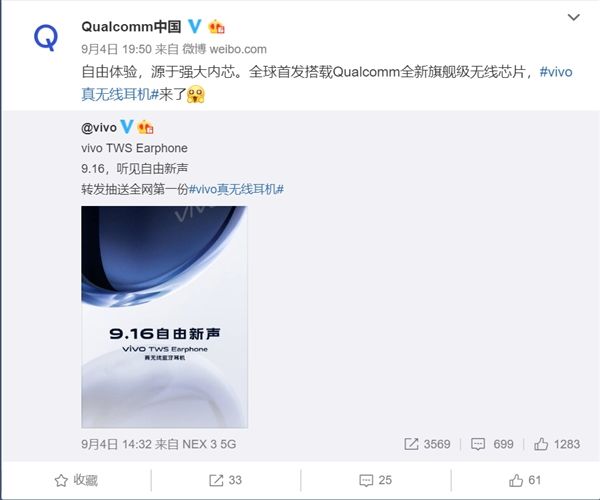 9月4日晚间,vivo真无线耳机TWS Earphone将于9月16日发布。 高通官方微博透露,vivo TWS Earphone全球首发高通全新旗舰级无线芯片。