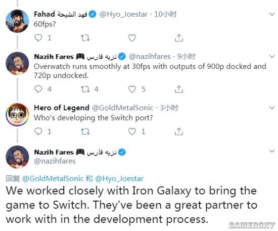 虽然在暴雪发布的公告中,我们却并没有看到相关的内容,但暴雪的IMEA通讯经理Nazih Fares在推特上透露了NS版《守望先锋》的运行效果。他表示,游戏在主机模式下分辨率为900p,掌机模式下是720p,而两种模式的运行帧率都为30帧。