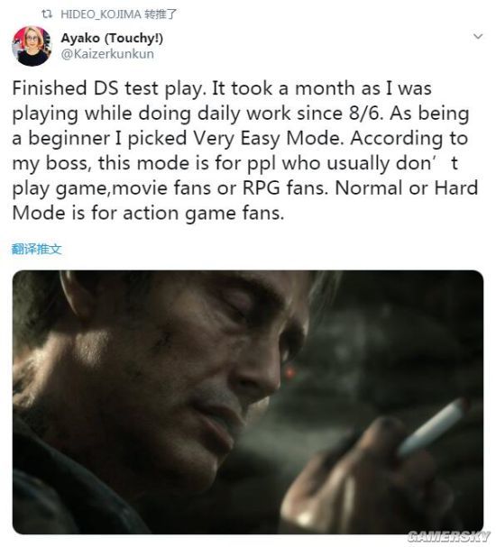 此外小岛秀夫的助理Ayako也发推表示,自己在兼顾日常工作的同时,通关《死亡搁浅》的极简单模式用了大约1个月时间,这个模式主要是为了不怎么玩游戏的粉丝准备的,而普通或者困难模式是为了动作游戏粉丝准备的。