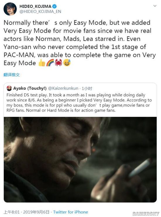 小岛秀夫今天发推特确认,通常情况下游戏只有简单模式,但是《死亡搁浅》为电影粉丝们加入了极简单模式,因为本作中有诺曼·瑞杜斯、麦德斯·米科尔森等真正的演员。即使是助理Ayako这种连《吃豆人》第一关都玩不过去的人,也能在极简单模式下通关《死亡搁浅》。