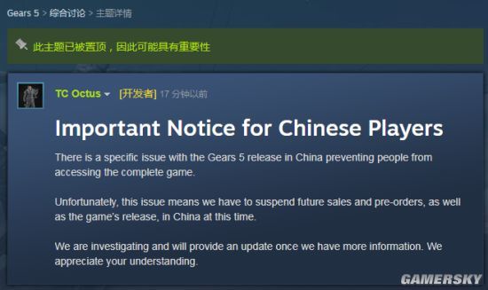 从昨日到今日,Steam上《战争机器5》上的预购、价格几度神隐,这波操作让玩家摸不着头脑。就在刚刚,《战争机器5》开发者在论坛发布置顶帖,称因为某些特定问题《战争机器5》将暂停在国区的销售和预购。