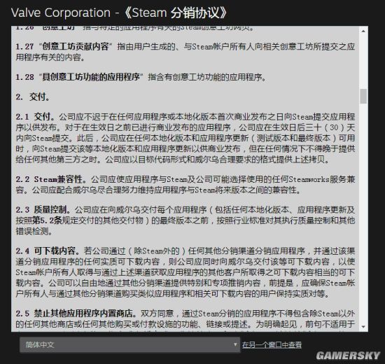Reddit论坛网友GTVA_Alpha近日发帖称,V社近期更新了Steam分销协议,在本次更新后,V社在条款中加入了“公司应不迟于在任何应用程序或本地化版本首次商业发布之日向Steam提交应用程序以供发布”的相关规定。