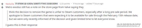 另一位网友就提到了 《地铁:离去》在发售前突然宣布下架Steam 的往事,在当时V社也在Steam商店公告中谴责“在经过很长时间的预售阶段之后”,做出这样移除游戏的决定“对于Steam消费者”并不公平。可能V社是为了防止此类事件重演,才在分销协议中加入了这样的新条款。