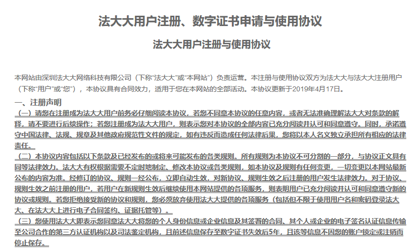 另外,企业在用户签署合同的时候,可以采用更具法律效力的第三方电子合同平台进行。以法大大电子合同为例,企业和用户在签署合同需要经过实名认证、真实意愿认证的操作,并且能够将签署完成的合同进行云端储存,就算未来产生纠纷,也可以迅速举证,保护双方的合法权益。