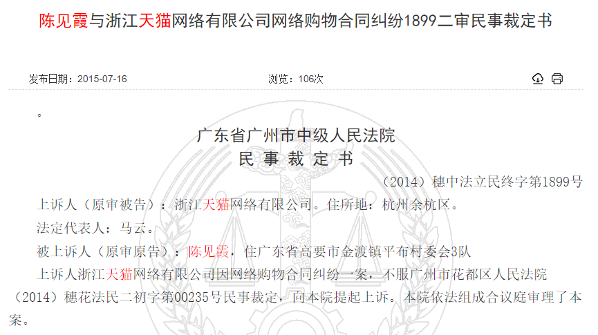 △陈见霞与天猫网络合同纠纷二审民事裁定书