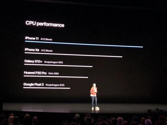 苹果难得的把 A13 芯片与市面上主流厂商的芯片进行了对比。