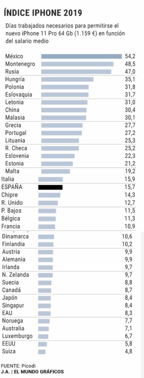 但事实上并不是每一个国家都是这样的,近日,西班牙权威媒体做了一项十分有趣的统计,他们以西班牙当地的iPhone11Pro售价计算了各国劳动者买一台64GB的iPhone 11 Pro所需的工作天数,如下图所示。