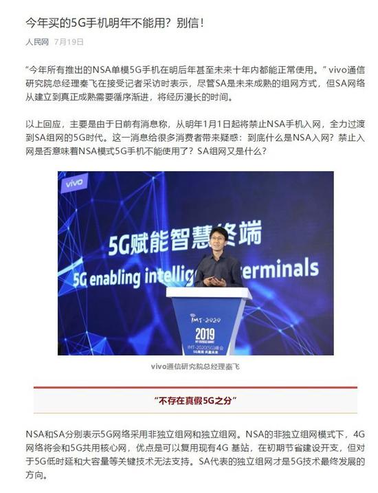 有人说NSA是假5G,理由是其线路并非完全具备5G属性,且5G网络应该具备的eMBB(增强移动宽带)、URLLC(超高可靠低时延通信)和mMTC(海量机器类通信)三大特性并不完备,只支持这种制式的手机到明年就不能用了。但实际上,NSA制式5G标准也是由3GPP组织制定冻结,终端体验也拥有5G网络定义的特性,且未来十年都可以正常使用。