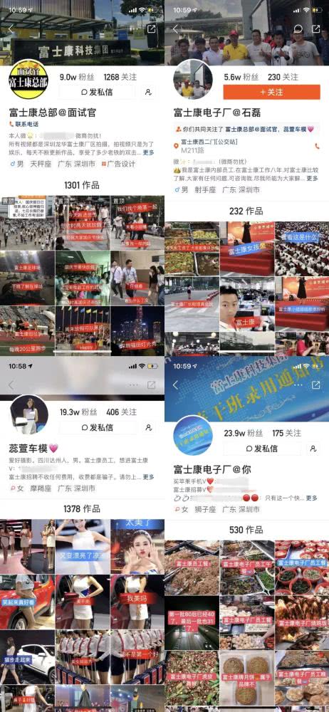 而为了能获得更多上推荐位的机会、避免视频被平台判定为广告而封禁,熊二在一些平台上的账号名称会用“富土康”来代替“富士康”,这其实算是某种被普遍认可的“行业共识”。“这也是我不太喜欢用抖音的原因。”熊二说,“抖音这方面查的太严了,发招聘信息很容易就被封号。”