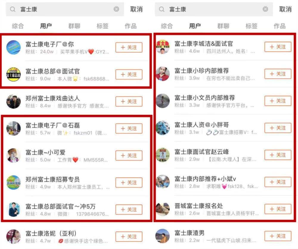 毒眸在快手、火山视频等短视频平台搜索“富士康”时,发现很多粉丝量靠前的用户,名字里基本都会带有“招聘”、“推荐”等字样。而他们的个人介绍里,也都会附带上个人微信、电话以及“找工作请联系”等文字,有的人甚至还会建立多个QQ群或开展直播业务,用来发布招聘信息。