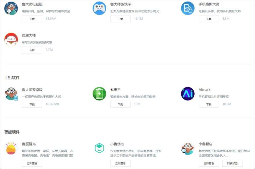 鲁大师,全称360鲁大师控股有限公司,最初是一款电脑硬件评分软件,以此吸引流量。移动互联网来了,鲁大师的硬件评分流量入口从PC拓展到PC+手机——鲁大师电脑版、鲁大师安卓版、Almark(手机芯片评测)等。