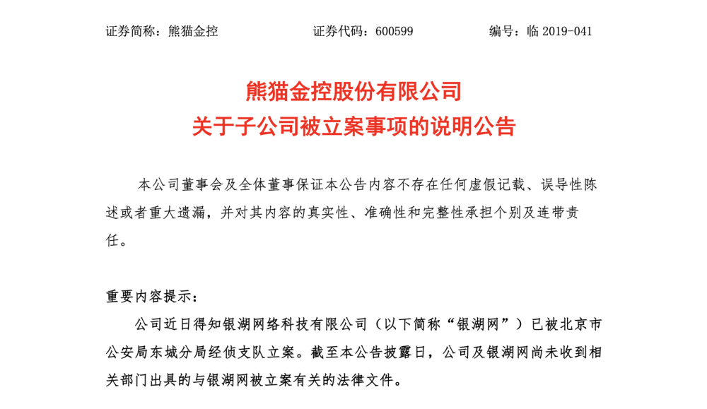 2019年10月9日晚间,A股上市公司熊猫金控发布公告称,公司近日得知旗下公司银湖网络科技有限公司(即“银湖网”)已被北京市公安局东城分局经侦支队立案。消息一出,近3万户股东一夜无眠。
