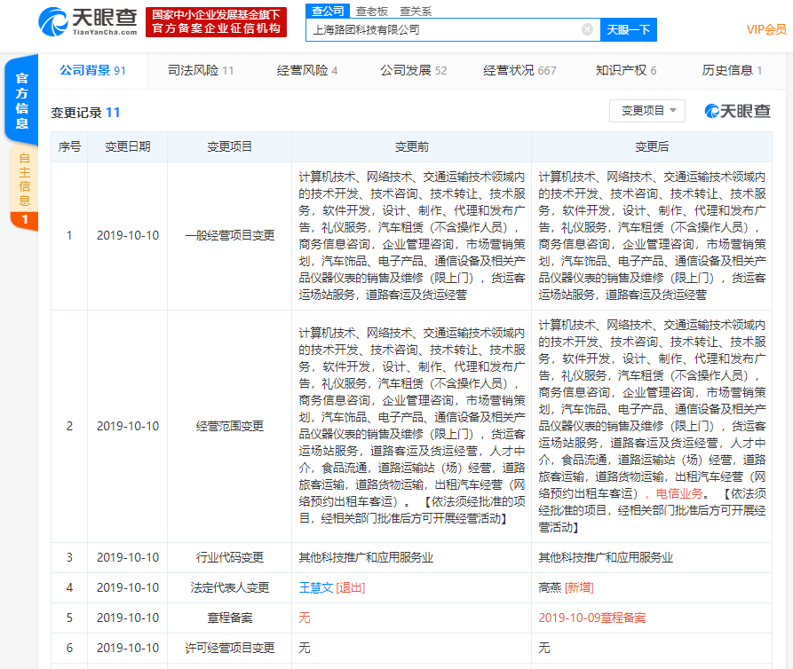 网易科技讯 10月12日消息,据天眼查数据显示,美团打车的运营主体上海路团科技有限公司发生工商变更,原法定代表人王慧文卸任,由高燕接任。此外,经营范围也发生变更,新增电信业务。