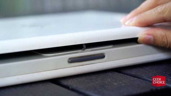 首先要说的是这个可拆卸式的键盘,你只要拧开最上方的锁定开关,然后拨动两个卡扣,就可以轻松地将它拆下。苹果现在卖的妙控键盘和它长得很像,不知道是不是借鉴了这里的设计。