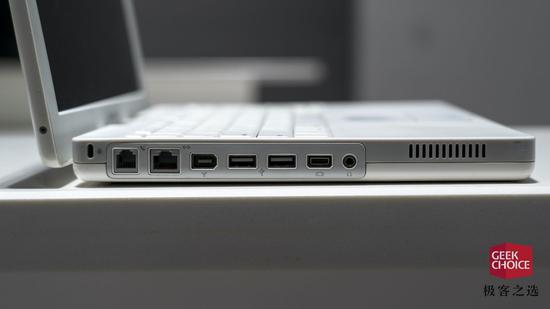 iBook G4 还有一点与现在的 MacBook 不同,那就是丰富的接口支持。笔记本左侧有电话线接口、网线接口、FireWire 火线接口、两个 USB、Mini VGA、3.5mm 耳机接口。当时的火线接口还是很受极客用户欢迎的,这是苹果领导开发的一套接口标准,可以同时供电和进行数据传输,实际速度比 USB 2.0 还要高。不过后来因为专利许可费的纠纷,没有推行开来,后来苹果用 Thunderbolt 雷电接口将其取代。