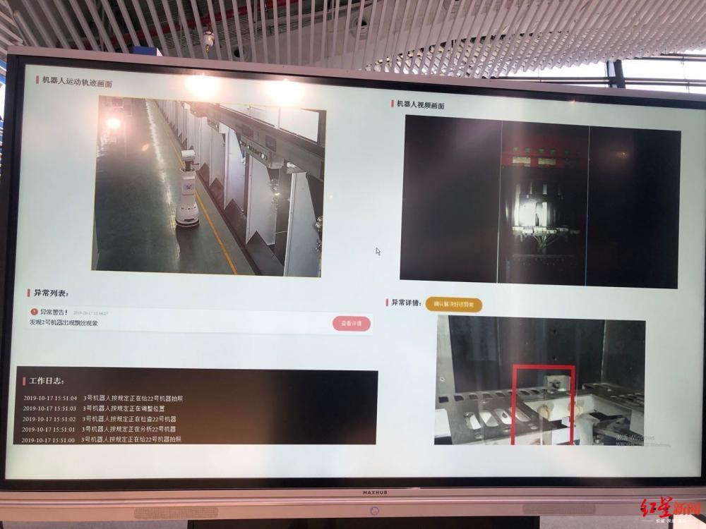 在新凤鸣集团的展台,红星新闻记者被显示屏中展示的画面震惊住了。只见画面中实时展示着该集团长丝生产车间的工作状态。偌大的工厂内,红星新闻记者居然只看见了两名工人,而这两位工人看起来似乎有些无所事事,要么坐着,要么是看起来随意的走动着。而工厂内的机器臂正在飞速的工作着,几台白色的小车穿梭其中。显示屏还实时反馈着车间内的情况,“异常警告,发现2号机器出现飘丝现象。”“3号机器人按规定正在调整位置。”红星新闻记者不禁向展台工作人员提出提问,这不是纺织车间吗?纺织女工哪去了?