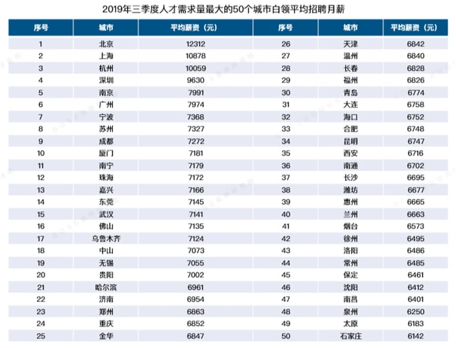 报告显示,2019年三季度,人才需求量最大的50个城市白领平均招聘月薪为8325元。北京白领平均月薪为12312元,领跑全国。位列榜单二、三位的上海、杭州两城平均月薪也均过万元,分别为10878元和10059元。