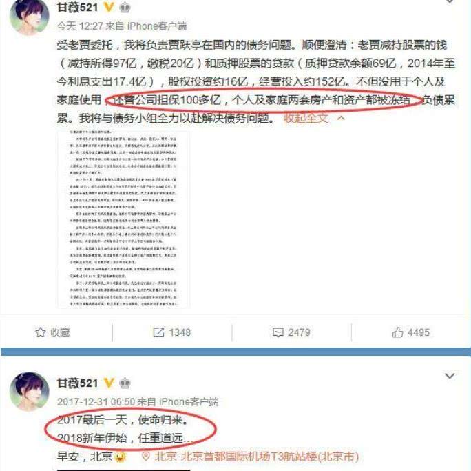 2018年1月3日凌晨,甘薇在微博发布长文《一位妻子的独白》。在此文中甘薇说到:“老贾是一个有梦想的人,原本可以选择一条比较舒适的生活和轨迹创业,但却选择了一条艰难无比的道路创业,为了事业义无反顾。这是老贾的优点,也是他的缺点。今天,老贾阶段性创业失败,很大的问题是他有超越常人的梦想,不断地挑战自我、挑战极限,结果挑战过度。”