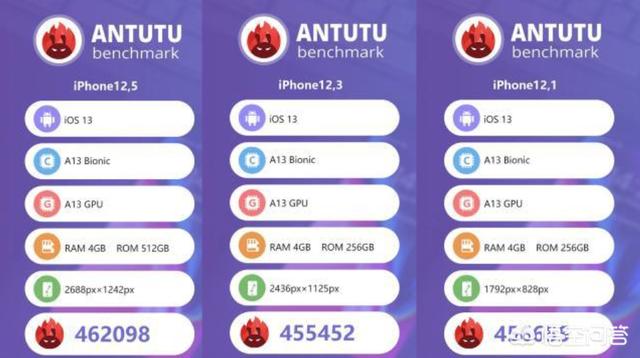以最新推出的Iphone11为例,安兔兔就率先推出了相关的数值,iPhone 11跑分为456655分,iPhone 11 Pro跑分为455452分,iPhone Pro Max跑分为462098分。这个分数相比去年的A12来说性能提升有33%左右,但是对比iPad Pro A12X的55万分还是差距不小。