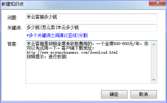 点击米云右上角【机器人回复】进入设置页面,选择分类管理可对话术进行分类,方便管理;点击新建知识点即可进入新建知识点窗口。