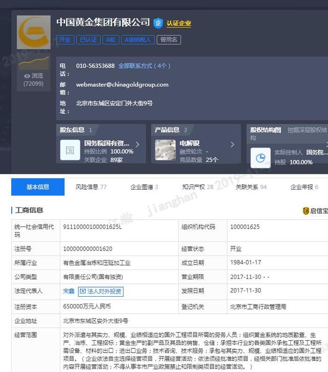首先,我们要明白黄金到底是什么?在大多数人眼中黄金是一种我们非常陌生又非常熟悉的商品,在我们日常生活中我们大量的语言和词汇都和黄金有关,但是实际上我们几乎没有任何一个人用黄金买过东西,大家最熟悉的可能就是黄金饰品。但黄金在人类历史上的作用却非比寻常,这是全世界各国人都普遍采用的货币,马克思有句经典名言“金银天生不是货币,但货币天生就是金银”。这是因为黄金是我们老祖先所找到的所有商品当中最稳定最方便交易使用的东西,所以全世界各国人无论种族国家都采用了黄金作为自己的交易货币,然而随着上个世纪美元与黄金的脱钩,金本位制的时代已经离我们越来越远,但是我们要明白在人类的所有商品当中黄金的稳定是前所未有的,这也就导致了黄金虽然不是货币却是人类最重要的避险商品,所以一旦国际经济形势出现比较大的波动的时候,在我们看到的最大的现象就是黄金价格上涨,所以黄金是世界经济稳定的一种逆向指标。例如中国黄金交易一般由中国黄金集团有限公司提供,具体信息可见下图启信宝的数据。