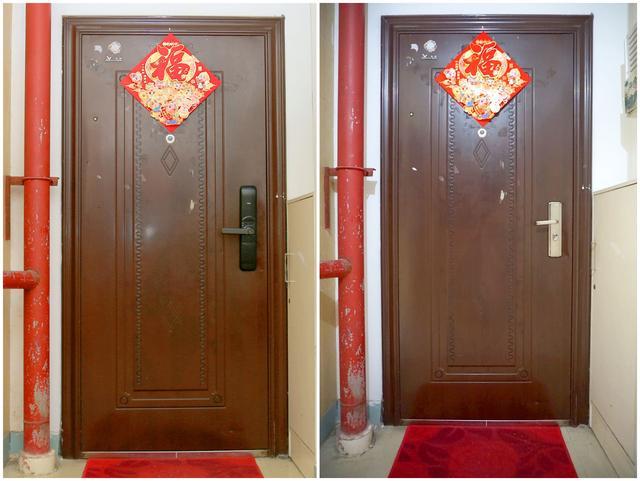安装师傅的手艺真是不错,非常细心的没有弄坏门其他部分。整个安装过程大概50多分钟。黑色流光似彩的拉丝面板,和家里棕色的大门一搭配,立马很有高档小区的感觉。
