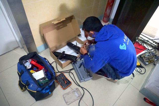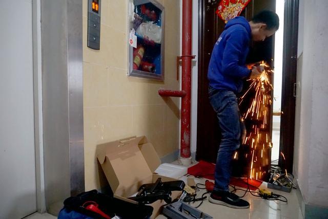 拆掉旧门锁后,师傅先比对一下原来门板上锁孔的大小是否合适TCL物联网智能门锁K5的锁孔和齿轮,发现原来开口偏小之后,又锯又锤的开始折腾了。