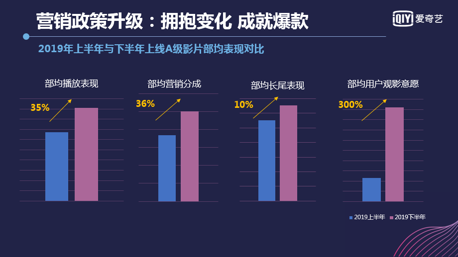 更直观的反映是,爱奇艺数据显示,2019年下半年,平台网络电影的部均观影意愿较2019年上半年提升了300%,部均播放表现、营销分成和长尾表现也有不同程度的提升。