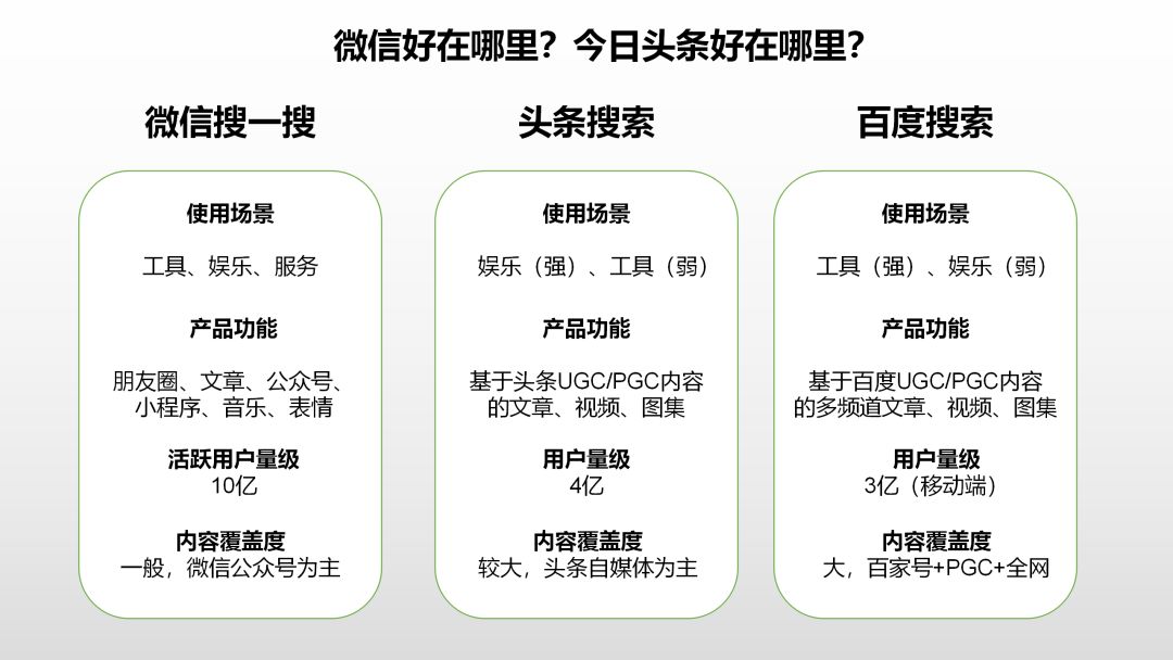第二战是搜索之战,主要参战方是搜一搜、头条搜索和被动参战的百度。搜一搜近一年不断优化,不断拓展搜索范围,目前除了能搜到一般的网页内容,还能搜到公众号、小程序、圈子、视频,基本是腾讯系的内容都打通了,完全可以满足常规的搜索需求,能搜一搜的,基本不会再离开微信去百度搜索,使用率也是呈爆发式增长,在移动搜索这块抢占了不少的份额,也帮助腾讯系的内容获得了更多的流量。头条在前两天也推出了头条搜索,主要针对的也是移动搜索,感觉对标搜一搜的意图更为明显。内容是头条的立命之本,搜索是内容的重要入口,疫情期间更为明显,在推送没发满足人们对咨询的诉求时,搜索便是首选,疫情期间最大的信息流量在微信,因而生态内的搜一搜也得到了红利,包括整个腾讯系的内容流量都得到了增长。头条正是看到了这样一个趋势,担心微信构建起的信息牢笼封锁住用户,正式在搜索领域发起了战争宣言。相对而言百度是被动参战的,或者说也没百度什么事,百度的优势依然存在桌面端,使用PC时,搜索还是百度的天下。但可见的是,以后搜索将会成为内容的重要壁垒,巨头会尽量的争取用户使用自家的搜索,从而让自家体系的能容和产品得到更多的曝光,同时弱化甚至屏蔽对手体系的内容和产品。