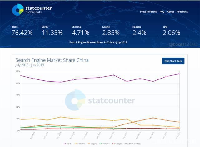 2011年以来,百度一直是中文搜索市场霸主。据StatCounter Global Stats数据,2019年7月百度搜索全平台市占率为76.42%,搜狗、神马等瓜分剩下的25%。百度财报中“线上营销”板块的营收,70%以上来自大搜业务。