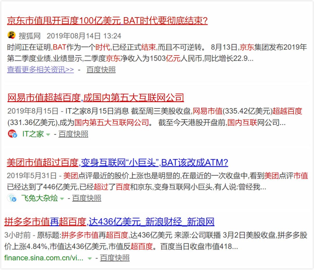 美股大跌,很多人想看看互联网公司又有什么新行情。结果没看到什么不一样,又在新闻资讯中看到了熟悉的身影:京东/网易/拼多多市值超百度。去年以来,这样的新闻隔三岔五出现,让人怀疑这些公司是不是商量好了,组团儿来黑百度。