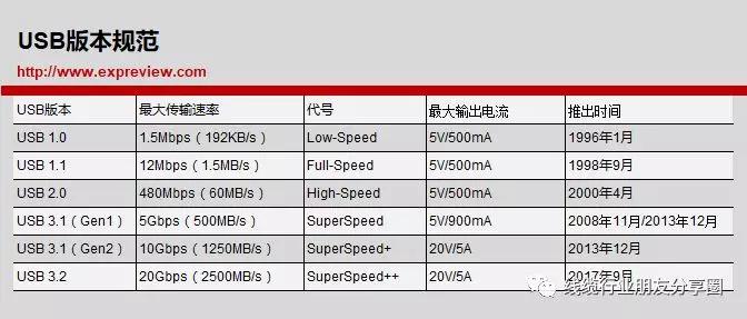在USB 3.x这一代USB标准上已经出现了USB 3.1(Gen 1),USB 3.1(Gen 2)和最新的USB 3.2,它们之间的差异主要集中在速率称号,最大传输速率和输出电流上,下面的表格就很清楚地列出了这几个USB 3.x有什么不同。