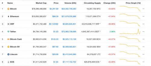 3月12日黑天鹅出现,美股再次启动熔断机制,这是3月9日美股标普500开盘跌7%触发熔断机制之后的第二次。一周之内出现两次。同时,3月12日晚间,比特币出现急速下跌,行情出现瀑布画面,引起币圈轰动,整个数字货币市场价格震荡。市值排名前10的币种价格跌幅均下跌了40%以上。(稳定币除外)