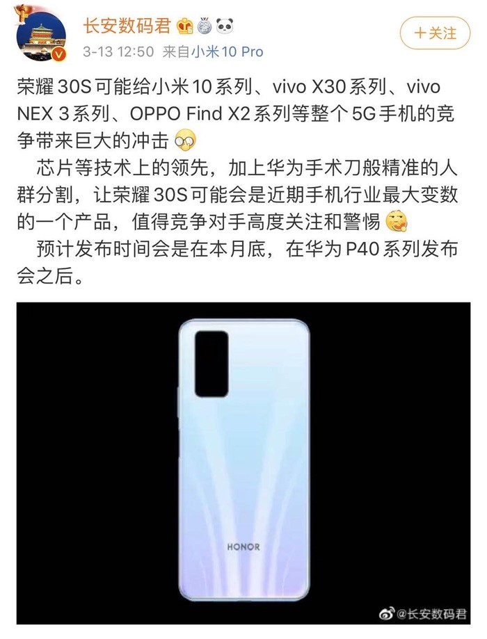 赵明默认荣耀30S首发麒麟820?网友:值得友商高度警惕