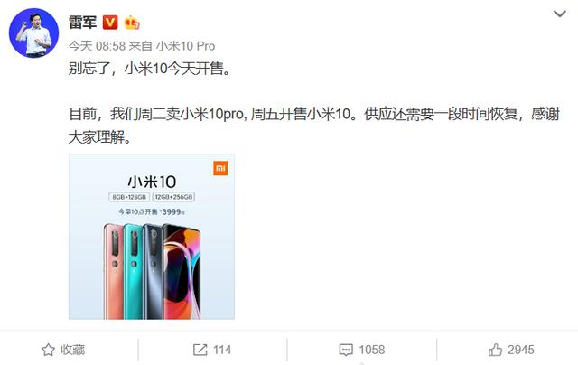 3月13日早间,雷军在微博表示小米10今天开售,大家别忘了。另外小米10 Pro周二开卖,周五开售小米10是因为供应还需要一段时间恢复,感谢大家的理解。疫情影响着供应链,没有生产线的手机厂商们只能等待配件的供应,所以小米10批量阶段性发售也是情有可原的。