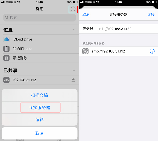 接着在“连接服务器”界面中的“服务器”一栏中,按照规定的格式填入之前确定的电脑IP地址,比如:“smb://192.168.31.122”,再选择“连接”。