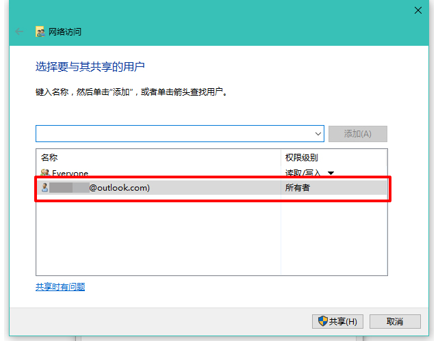 由于从iPhone手机访问Windows共享文件夹必须要输入用户名和密码,所以接着为共享文件夹选择一个用户,这里可以直接选择电脑的“所有者”。然后在点击“共享”按钮。