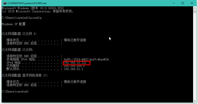 接着在弹出的黑色命令提示符窗口中输入“ipconfig”,在红色方框圈出的地方,就是这台电脑的IP地址了。比如我的电脑IP地址是“192.168.31.122”。