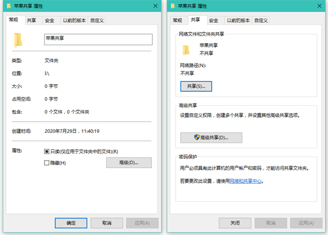 接着右键打开“苹果共享”文件夹的属性,在上方的选项卡中选择“共享”,然后点击“共享”按钮。