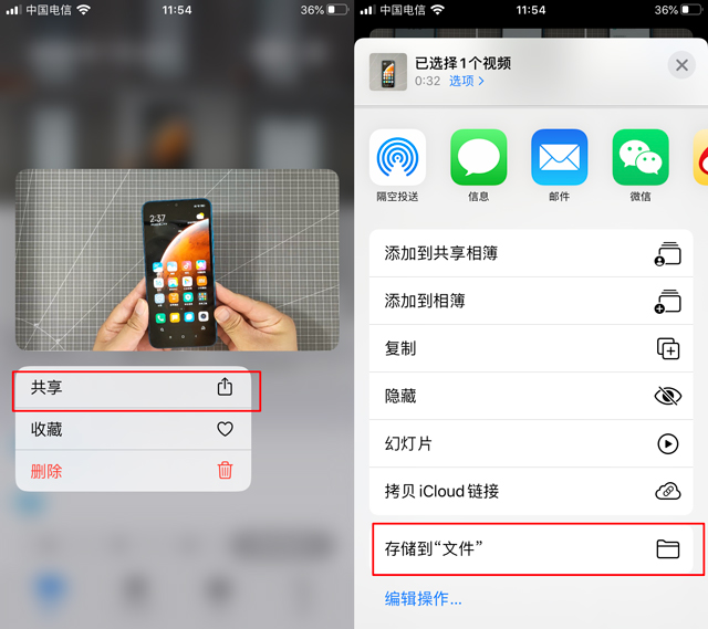 这时在菜单中选择“共享”,然后在共享界面中拉到最底部,选择“存储到文件”。